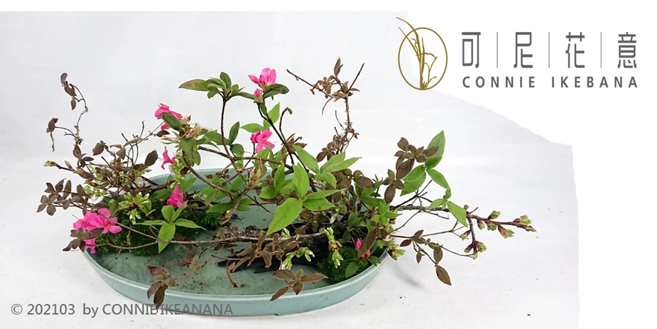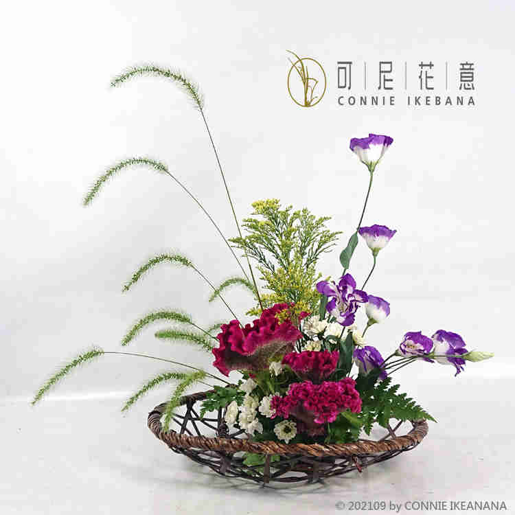 火鶴花以橫向插作,利用花朵本身邊緣的形狀,配合白色的咪咪草的弧形表現,在盛器的選擇上採用白、紅兩色的扁窄弧形花器,花朵的安排也超出花器的外緣,可見作品的呈現是刻意的將容器與花材做整體安排,也就是說作品本身的媒材不只是放眼在花木,而是把花器也當成作品的一環。